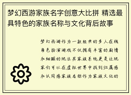 梦幻西游家族名字创意大比拼 精选最具特色的家族名称与文化背后故事